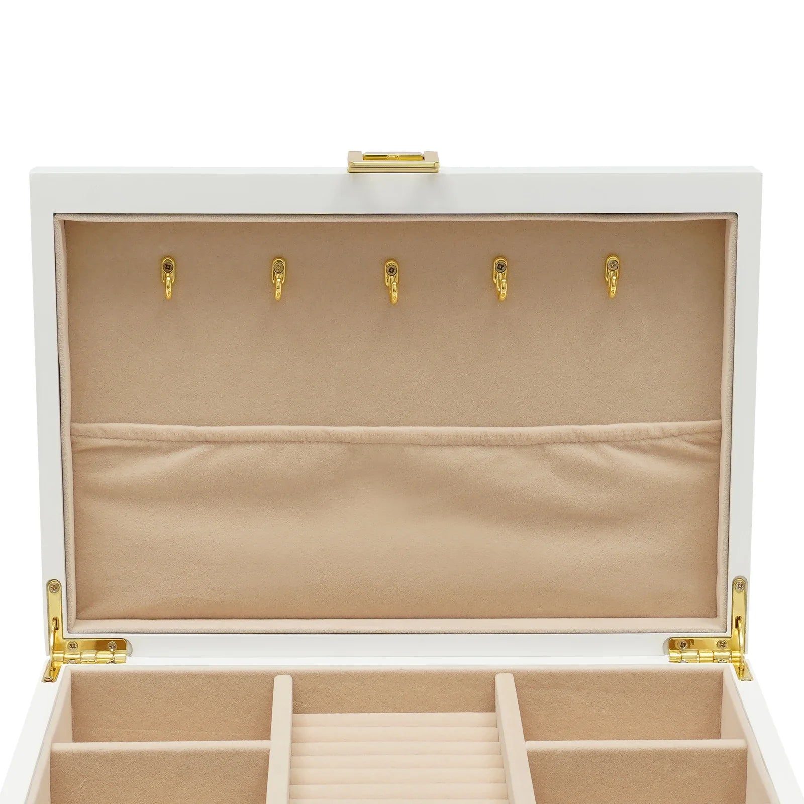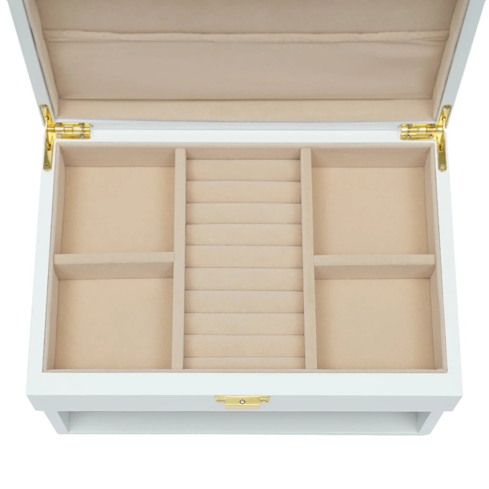 - Compartiments supérieurs : plusieurs cases pour bagues, boucles d’oreilles et petites pièces
